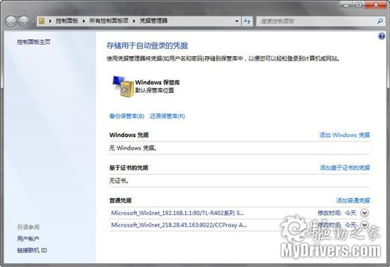38、管理凭证。新的凭证管理器。从XP、Vista里的网络密码管理升级而来,将网站用户名、密码保存在Windows Vault里,可管理可备份可还原。