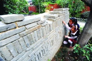 记者来到游府西街小学实地探访,古城遗址就位于校园的东南角,在文物专家的帮助下,学校在原址复建了一小段当时的夯土城墙。专家的鉴定意见就写在这段复建城墙的旁边:这处城墙遗迹应与六朝建康宫城(台城)的外重城墙的南墙有关,有可能是端门西侧的一段。这处“地标”看上去并不显眼,倚着土堆而建的灰砖看上去并无纹饰的美丽,而是显得质朴无华。城墙用的材料都是原来的出土文物,材料已经有近1700岁了,只不过是从地下5米提升到了地上。