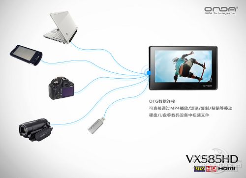 对于HDMI数字视频输出,OTG数据连接功能是必不可少的。OTG是On-The-Go的缩写,是近年发展起来的技术,更是未来数码设备的标准配置。昂达VX585HD全面支持OTG功能,您只需将移动硬盘连接至播放器上,就可以通过OTG功能将移动硬盘中的文件直接在MP4或者电视中播放,异常方便,也足以让你的MP4空间无限扩展。此外,VX585HD还支持U盘、MP3/MP4、PDA、移动电话、数码相机、数码摄像机、U盘等多种数码存储设备间的数据交换,可进行播放/浏览等操作(升级固件支持复制/粘贴),真正实现数据的相互交换。