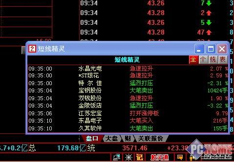 在短线精灵窗口,股民用户可以看到右上角有四个小按纽,分别为:全、个、统、表。其中“全”中显示股市上发生异动的全部股票,具体如图3所示,可以看到哪些股票被拉到了涨停板,哪些股票软件遭到了猛烈打压。虽然也可在同花顺软件“报价”里面“综合排名”查看快速涨幅排名,今日涨幅排名等实时排名,但需另外切换界面,短信精灵则无需新切换操作,非常便捷。