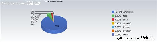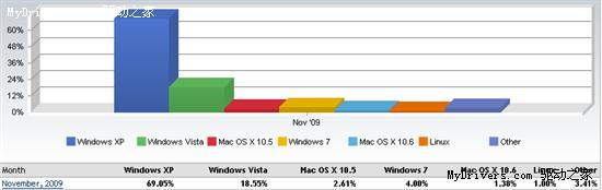当然了,冰冻三尺非一日之寒,Windows XP在操作系统领域仍然占据着绝对优势。11月份,XP市场份额为69.05%,Vista为18.55%,Windows 7则在短短一个月的时间达到了4.0%的市场占有率。在操作系统市场,Mac OS X份额出现了些微下滑,下跌了0.16%至5.12%。Linux则为1%。