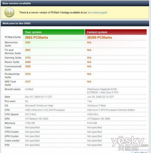 综合性能测试PCMark Vantage,总分3863,接近4000。