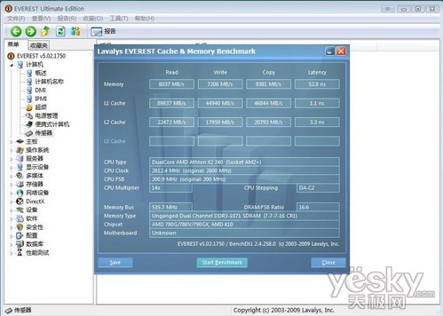 内存与CPU 缓存测试,虽然主板默认运行的DDR3频率在1066MHz,但copy仍然达到9000多MB/s。
