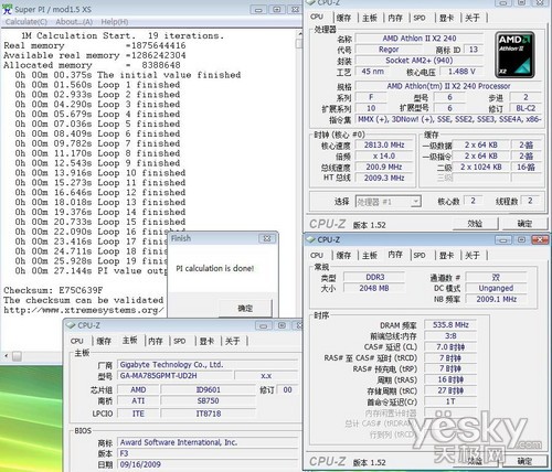 CPU超到3.78GHz,运行SuperPI 1M,时间是21.653秒,比原来快了5秒多。在测试中,AMD X2 240在默认电压下能超到4GHz以上,可惜不能进入VISTA系统,如果再对CPU加压,X2 240应该能顺利超到4GHz以上。技嘉MA785GPMT-UD2H主板在CPU超频方面表现不俗。