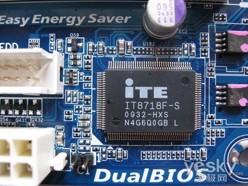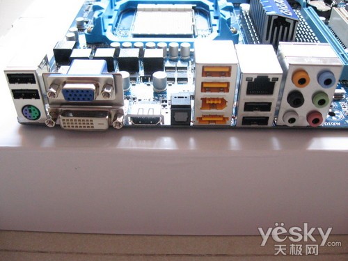 I/O接口部分,提供了PS/2接口,6个USB接口,光纤S/PDIF接口、VGA/DVI/HDMI全视频接口、e-SATA接口、IEEE 1394接口,足以满足用户的使用需要。