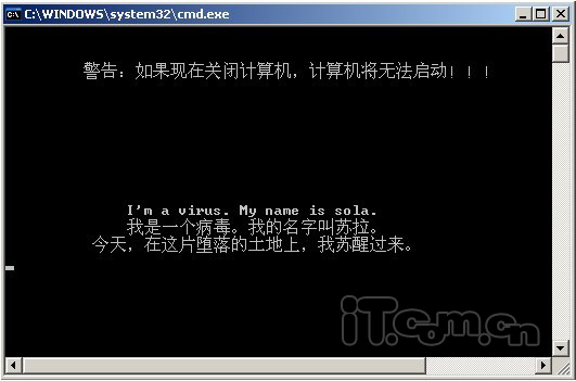 若用户回答问题正确,病毒恢复NTLDR,并且进入自我清除模式。若用户回答失败,则进一步破坏系统,使用户不得不重装系统。如果各位无法正确的回答问题的话,那么该怎么办?(“死亡问答”(Sola)病毒的留言动漫问题与答案游戏问题与答案)