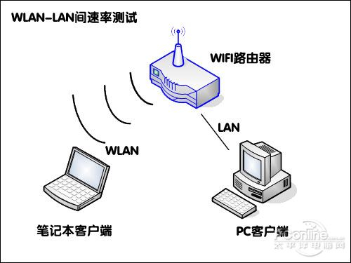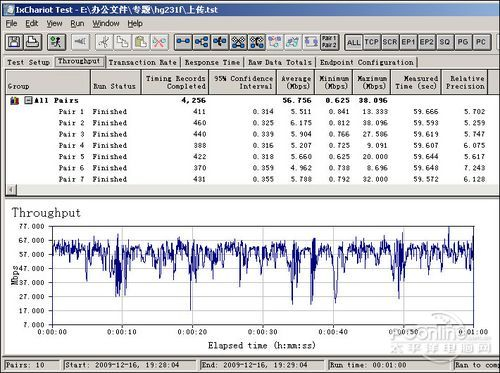 速率测试环节我们采用了英特尔(迅驰2)平台和Intel(R) WiFi Link 5100 无线网卡做兼容测试,并使用被业界公认的常规测试软件Chariot 5.4来进行。Chariot测试采用了两台服务器,安装NETIQ公司的Chariot软件,一台接路由器WLAN口,一台接LAN口,通过统计一个预定长度和格式的脚本文件无差错地从一台服务器传送到另一台服务器的时间来计算出路由器的Throughput(吞吐量)