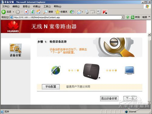 第一次登陆HG231f管理界面会进入自动安装界面,这个可以与光盘里安装向导一样,会一步步指导新手来设置路由器。有经验的用户可以切换到“手动配置”界面上去。