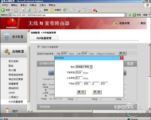 在高级配置里我们可以设置家长控制管理功能,可以设置允许指定的电脑在规定的时间上网和断网。或是只允许它访问指定的网站。另外我们看到HG231f拥有非常优秀的QoS流理管理工具,所有HG231f下面的客户端都直接明了的显示在P2P流量管理界面,在设置了我们互联网总带宽后,就可以一个个点击下面的机器图标来分别调协每台电脑的带宽。
