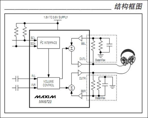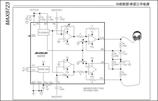 MAX9723立体声耳机放大器采用Maxim拥有专利的DirectDrive结构,省去了传统单电源耳机放大器中较大尺寸的输出耦合电容。MAX9723包括两个62mW AB类耳机放大器、硬件/软件关断控制、反向电荷泵、集成32级音量控制、BassMax电路、全面的杂音抑制电路和一个I2C兼容接口。电荷泵对内部正电源(VDD)进行反向变换,产生负电源(PVSS)。VDD和PVSS对放大器供电,增大了放大器的动态范围,几乎是其它单电源供电放大器的两倍,提高了总输出功率。