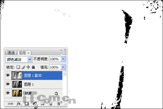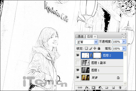 6、取消图层1副本的可见性(单击眼睛),然后在蒙版上使用黑色的画笔工具涂抹人物,把人物还原出来,效果如图所示。