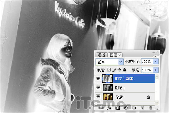 2、按下Ctrl+J复制出图层1副本,然后选择“图像—调整—反相”命令,效果如图所示。