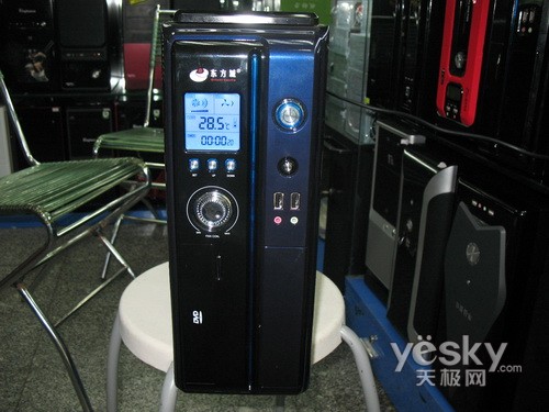 东方城魔方9号机箱的前置面板布局相当有条理,简约却相当美观。操作按键全部位于机箱面板顶部,液晶屏及开关按键摆放有序。有一个超大的机箱温度和工作状态的液晶显示屏,方便用户查看两个风扇转速、机箱内部温度、时间等信息,非常个性。在面板上部右侧,有序地排放着开机键,重启键和2个USB 2.0接口,方便用户的使用。按钮全部采用拉丝工艺执照,光滑亮丽,显得相当高贵。此外,机箱的光驱位位于面板下部,采用侧放布置。