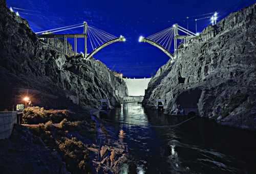 气温已经超过了46℃、风大得足以吹断起重机的吊臂、而且还要悬在271米的空中,用“严酷”二字似乎都不足以形容横跨科罗拉多河的麦克·奥卡拉汉-帕特·提尔曼纪念大桥所处的环境。这座跨度达580米的大桥被设计用来缓解道路狭窄、曲折的胡佛大坝上的交通流量,明年秋天建成之后,它将成为西半球最长的混凝土双肋拱桥。整座大桥由106块超高强度混凝土件组装而成,工人们登上峡谷的两壁,掘开上面的岩层安装混凝土桥桩。为了建造跨度323米的两个主桥墩,他们要一次连续浇铸7.3米高的混凝土。到今年主桥拱结构合龙之前,尚未完工的两端都是依靠一座独立的临时斜拉桥支撑起来的。hooverdambypass.org