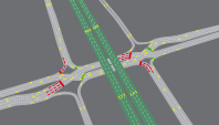 车流靠近高速公路时,在第一个信号灯路口转向靠左侧行驶。比如这幅示意图上从右侧向左侧行驶的车辆,如果想要开上向北走的高速路,只要直接右转 [A] 就能进入高速公路匝道 ;而如果想要开上向南的高速路,只要在穿过高速桥后顺道路左转 [B] 进入匝道即可。车辆完全不需要在路口左转弯穿过危险的反向车流。