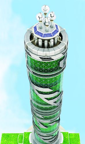 到 2025 年,世界人口将从今天的66亿增至80亿,而大气环境模拟的结果却显示,在亚洲、美国中西部和非洲的广大农业种植区会出现连续的旱灾。如何解决全球农业面临的重大危机呢?哥伦比亚大学的环境学家迪克森·德斯帕米尔提出了一个前卫的方案:将农场转移到摩天大楼里。这些塔楼可以利用营养液、通过无土栽培的方式减少农业生产对能源的依赖(这些摩天大楼利用下水道中的污水发电以获取能源),同时还能制造出更多的食物。让农业向空中发展还能将原来的农田让给树木,而树木能够帮助我们减少大气中的二氧化碳。更好的是,垂直农场可以在我们消费食物的地点附近生产它们,这不仅能够节约成本,更能大大减少运输环节中的废气排放。要知道,如果将培育、运输粮食和牲畜的过程中所消耗的燃料——还有农场上那些动物打嗝放屁时排出的甲烷——统统计算进去的话,今天全球农业所排放出的温室气体要占到全世界温室气体排放总量的近14%。一座30层高的垂直农场预计造价为50亿美元,verticalfarm.com