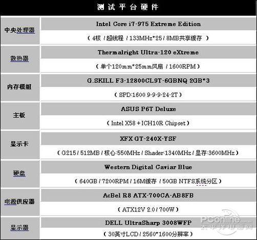 性能测试使用的硬件平台由Intel Core i7-975 Extreme Edition、ASUS P6T Deluxe主板和2GB*3三通道DDR3-1600内存构成。细节及软件 环境设定见下表: