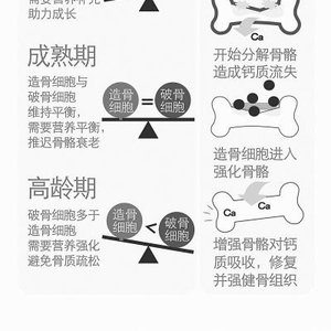 在人的一生中,随着年龄增长和身体状况的改变,骨骼的运动可分为三个阶段:成长期大约在20岁之前,此时造骨细胞多于破骨细胞,骨骼成长,骨密度增强;成熟期在30岁左右,骨密度达到峰值,造骨细胞与破骨细胞数量持平,造骨作用与破骨作用处于相对平衡的状态;衰老期时,破骨细胞多于造骨细胞,骨骼中的钙质大量流失,骨密度快速下降。