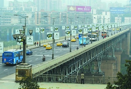 背景资料:据了解,连接渝中区和江北区之间的重庆嘉陵江大桥是我市主城首座城市大桥,1958年12月开工,1966年1月竣工。总长600.56米,宽21.5米。桥型结构主桥为铆合钢桁架双悬臂桥,引桥为钢筋混凝土T型梁。三分之二的桥身为钢材,三分之一的桥身为钢筋混凝土。嘉陵江大桥的建成通车前后历经8年时间,重庆人克服了苏联专家撤走、三年自然灾害等各方面的艰难困苦,才建成了这座大桥。 记者 纪文伶