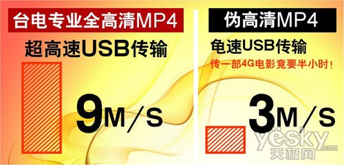 而台电“专业全高清”C510HD将拥有11MB/s的读取速度和9MB/s以上的写入速度。传输速率足足是“伪高清”的3倍!,让用户无论传输音乐文件还是大容量高清视频文件都能轻松自如。