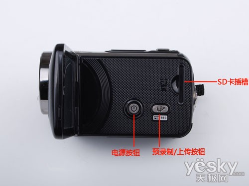 打开翻转屏幕可以看到AHD-Z10的电源按钮、预录制/上传按钮和SD卡插槽。爱国者在AHD-Z10上设计的预录制能够实现在按下录制按钮前多录制前3秒的功能,帮助使用者不错过突发状况。
