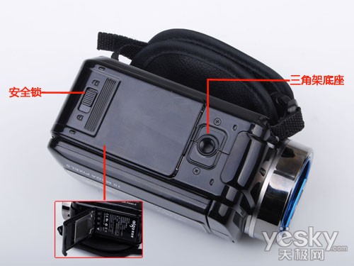 爱国者AHD-Z10机身底部是常规的电池仓和三角架接口,爱国者为AHD-Z10配备了一块1700mAh的电池,保证了其续航能力,电池仓外侧还特意安排了安全锁防止电池意外滑落。