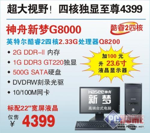 神舟电脑新梦G8000是一款高配PC里的超性价比台机,它完美诠释了神舟电脑比组装机更便宜的神话,采用2.33G Q8200四核处理器和1G DDR3 GT220独显,标配22寸液晶超大显示器和500G海量硬盘,4399元极限价,您还可以根据个人意愿添加100元升至23.6宽液晶,更大的显示器带来更广阔的视觉享受,为您的3D游戏体验加分,游戏爱好者们可以考虑一下哦!