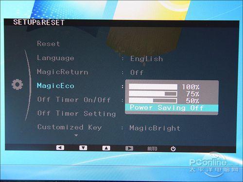 MagicEco技术则是出于环保的角度考虑设计的,开启MagicEco功能,有三种模式可供选择,分别是百分之一百,百分之七十五和百分之五十。这个百分比,就是说此刻该液晶显示器的功耗百分比。其实这个功能也就是降低屏幕亮度,建议用户还是自行调节亮度为宜。