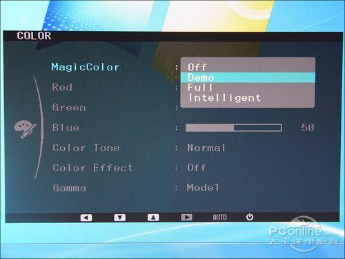 上图的第一副图是开启了magic Angle的效果,这个和广角概念不同,这个效果是从上下角度看到的画面是不会变形失真的,不过鉴于是TN屏设计,所以色彩的损失是必然的。而magic Eco功能,使用热键可以启动节能模式,有关闭、50%、75%、100%四种节能模式,通过调节亮度降低能耗,而且暗香的待机模式功耗仅0.3W。至于magic Return功能是当采用双屏显示的时候,其中一台显示器断电后,其显示的内容会自动转移到另外一台显示器上,这样提高了效率和安全性。