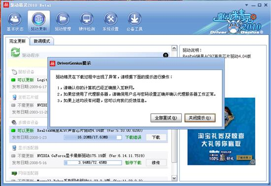 在下载过程中突然断网怎么办?特别是在更新网卡驱动或是升级过程中的意外断线情况更是多见。驱动精灵软件实现了对网络状态的自动判断,如果网络能够 迅速得以恢复,驱动精灵也会继续开始文件的续传工作。如果长时间未能连接网络,驱动精灵将通过提示窗口的方式告知用户问题。