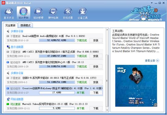 驱动精灵2010版本在强化了驱动精灵2009集成网卡驱动的基础上,还可以一并安装无线网卡的驱动程序,使用内部无线网络的用户在将会更加方便。