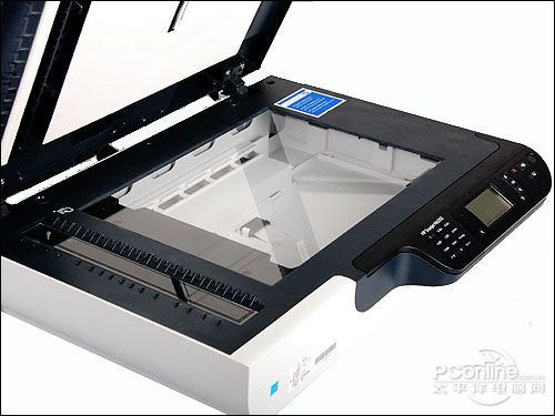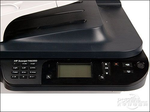 HP Scanjet N6350的控制面板在机器的最前端,黑色的底白色的字,一目了然,包括LCD面板在内一共有差不多10个按键,分工明确,可以根据LCD的显示进行操作,设计得很人性化。