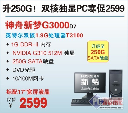 神舟电脑新梦G3000是一款入门级高配台机,为了迎接春节的来临将硬盘升至250G,为你存储海量影音娱乐资料提供强悍保障;此外,新梦G3000标配英特尔1.9G处理器T3100,NVIDIA G310 512M独显,17寸液晶显示器,整机华丽呈现,价格仅2599。愿这台配置均衡,优质低价的新梦G3000为你的假期娱乐带来不一样的感受!