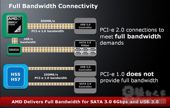 相比之下,Intel H57/H55芯片组只能提供PCI-E 1.0 250MB/s的带宽,同时提供SATA 6Gbps、USB 3.0接口完全不够用,因此仍需搭配桥接芯片。