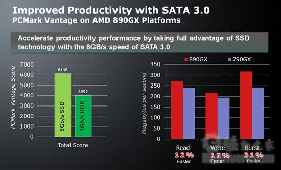 按照AMD提供的数据,在890GX主板上使用SATA 6Gbps接口后,PCMark Vantage测试得分可以大幅提升54%,而读取写入和突发传输速度也能比790GX平台加快12%和31%。