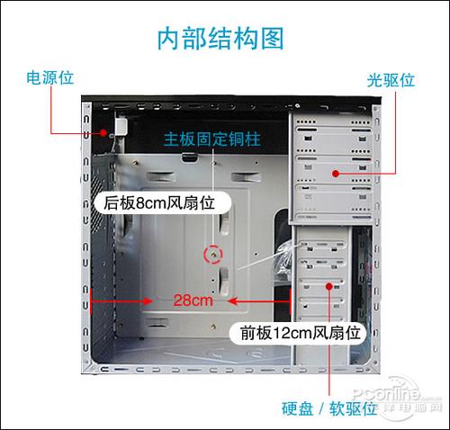 金翔 1872提供4个5.25英寸光驱位,7个3.5英寸硬盘位,机箱前面也提供了两个风扇位,整体设计完全符合38度机箱要求。