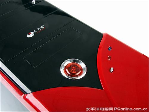 在东方城 卡卡乐2106机箱下方采用了两瓣玫瑰花花瓣式的设计,红色的圆形开关就好像花芯一样,并采用了金属质感包围设计,而重启开关和电源灯、硬盘则设计在右侧“花瓣”边上。