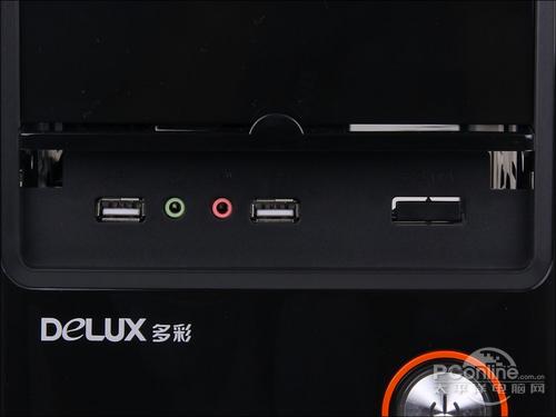 多彩 DLC-MT491机箱正面上部设置三个光驱挡板和一个前置接口挡板,在光驱口挡板及前置接口挡板的四周采用哑光磨砂处理打造出一条围边。三个光驱口所使用的是典型的卡扣式塑料挡板设计,其中一个挡板设计成嵌入式光驱弹出挡板。