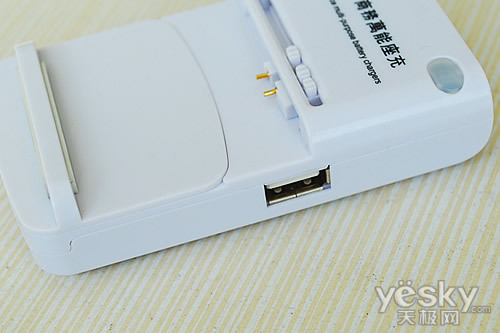 在机身右侧的位置,新式万能充提供了标准的USB接口,可以直接连接手机数据线,为手机充电,多功能的设计还是人性化的。在机身背面,可以看到标准的两项接头,方便手机用户充电使用,并且采用折叠式设计,遗憾的是,该充电器并没有采用可旋转式插头,可旋转式插头可以将两项插头接入三项插孔。
