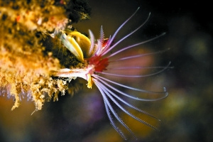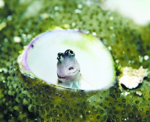 一只虾虎鱼(Goby fish)躲在珊瑚形成的洞中。虾虎鱼就是《海绵宝宝》中那些傻呆呆的鱼类的原型。