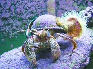 寄居蟹住在死去螺类生物的壳中。有时壳上会带着一两只海葵。有人认为海葵的毒刺能够帮助寄居蟹防御敌害。不知在寄居蟹的“楼市”里,带海葵的“房子”是否会卖出天价?