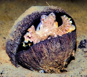 章鱼“能屈能伸”,可以把自己缩到很小的“家”里。去年,澳大利亚的朱丽安·芬(Julian Finn)博士在印尼北苏拉威西岛外海拍到一只章鱼努力搬动一只椰子壳,然后将自己完全装进壳里隐藏起来。