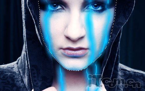 2、接着制作第一道激光电流。选择“画笔工具”并设置前景色“#00ccff”。然后选择“钢笔工具”(确保属性样中选择的是“路径”按钮,而不是“形状图层”),在人物的面上创建路径,如图所示。