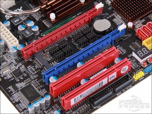 磐正 AK790+GTRD3提供4条常规扩展插槽,其中两条是PCI-E 2.0 X16显卡插槽,两条是PCI插槽, 可以支持混合交火以及X16 + X8级别的双卡SLI/CrossFireX,不过单卡和双卡模式的切换是手动的。显卡插槽间还有一个Mini-PCIE插槽,可以用于连接WIFI网卡之类的设备。没有PCI-E X1接口是个小小的遗憾。