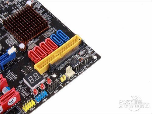 磁盘接口方面,磐正 AK790+GTRD3主板提供6个SATAII高速接口,其中四个红色的是SB750原生支持的,两个蓝色的SATAII及I/O接口处的E-SATA则由另一块第三方芯片支持。此外主板还提供一个黄色IDE接口和一个CF卡插槽,前者让用户可以方便的连接旧设备,后者则可以插入高速的CF卡制成DIY固态硬盘,其读写带宽达54MB/s,文件读写效率高速度稳。主板还在磁盘接口旁搭载了Debug灯和电源、重启、清空BIOS三个微动开关,方便用户调试系统。