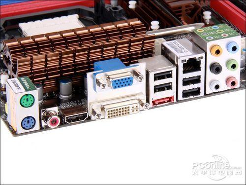 磐正 AK790+GTRD3主板I/O接口比较丰富,有2个PS/2、同轴音频、HDMI、VGA、DVI、E-SATA、4个USB2.0、RJ-45和8声道音频,能满足不同用户的不同需求。