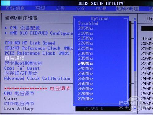 超频设置界面比较丰富,AMD K10系列CPU有专用的子设置页面,而超频主页面能设置其他CPU的倍频、外频、电压以及节能技术和ACC开核。