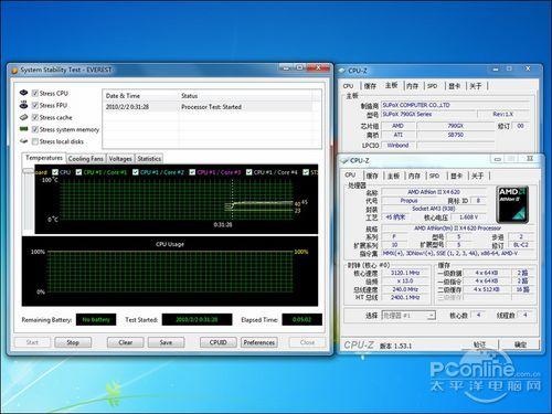AMD X4 620方面,这个CPU的默认电压是1.425V,我们在BIOS中设置加压0.15V,提升外频到240MHz超频,进入系统后用CPU-Z检测到电压为1.6V,比设定值高了0.025V,看来主板会自动加压,这时CPU主频为240MHz X 13 = 3.12G,成功通过Everest稳定性测试。