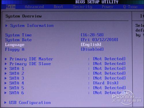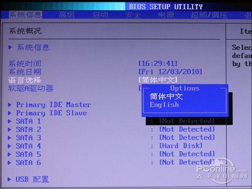 这款主板已经升级使用了大容量BIOS ROM,能设置更多的功能。默认情况下,BIOS界面是英文的。