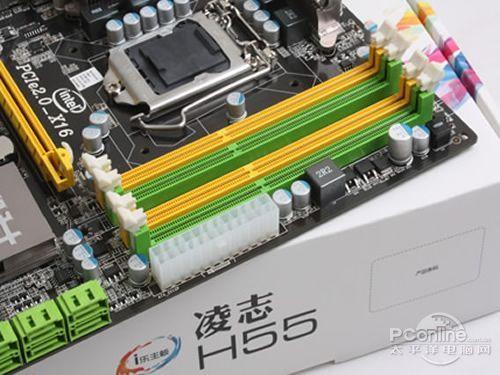 i乐主板凌志H55V主板提供了4条DDR3内存插槽,采用独立供电设计,支持双通道DDR3 1600/1333/1066内存规格,最大支持内存容量为16GB。使用单相独立供电,由低阻MOSFET,LF电容,1R0+2R2电感组成,规格比市面常见的H55要高,超频能力更有保障。